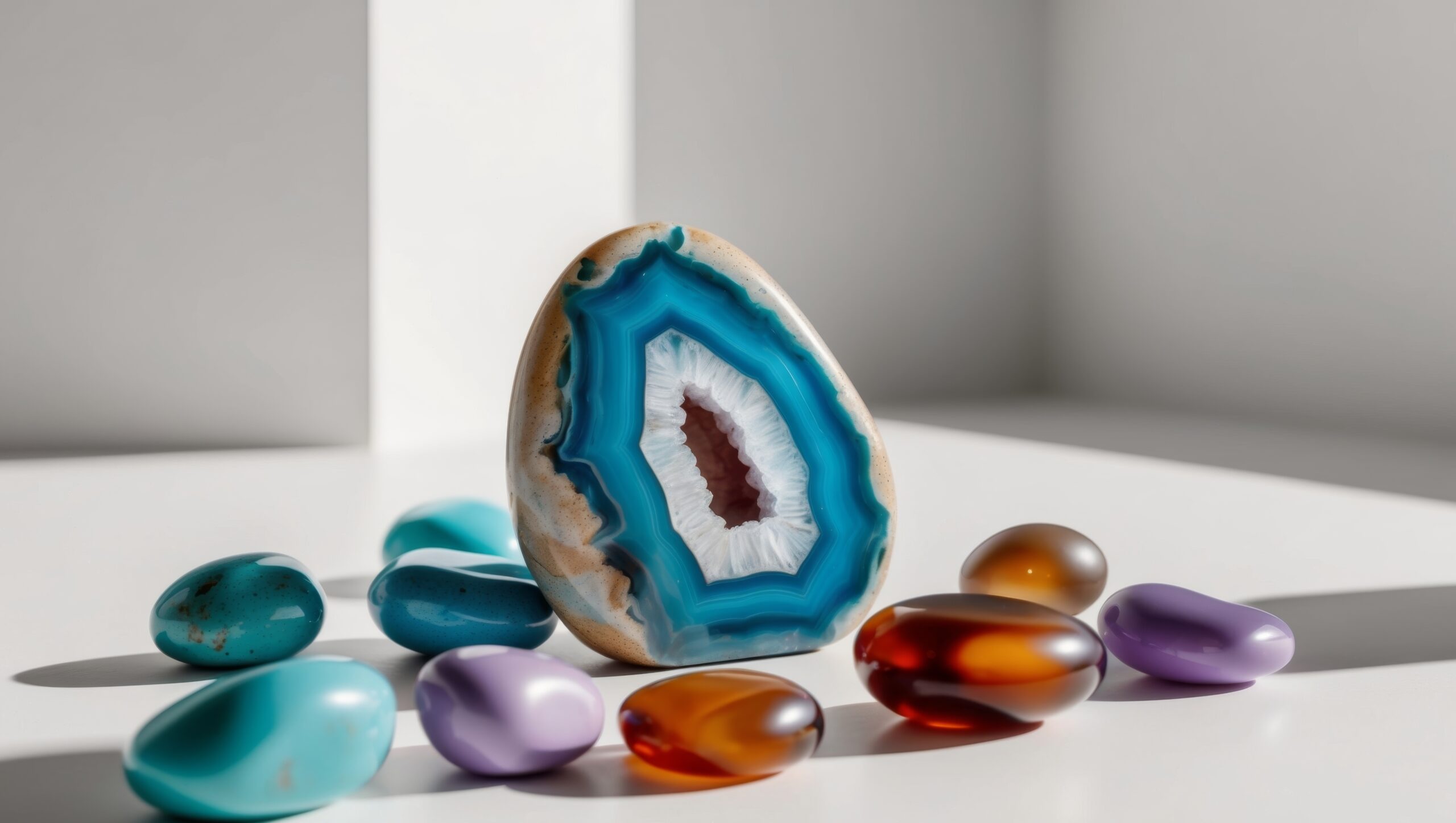 Description: Banded Agate is a beautiful grounding stone with distinctive layered patterns in earth tones. Each piece is unique, featuring natural bands of colors ranging from white and cream to brown and gray. This stone has been treasured for thousands of years for its protective and stabilizing properties.